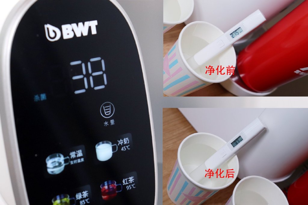 在自家接的自来水,使用TDS检测笔检测高达200多,经过机器净化之后再次检测结果降到了37,而这款净饮机也带有触控屏,上面也可显示TDS值,与检测笔数值几乎相同,净化效果非常不错!